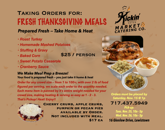 What started out as a catering company, has now grown into a two-fold business over the last several years. While catering remains a large part of what we do, we have become well known in the Lewistown, PA area for our "Freezer Meal" dishes as well. Whether you're looking for help to pull off your next event, or looking for a tasty dine-in option, we're glad you stopped by, and look forward to serving you!