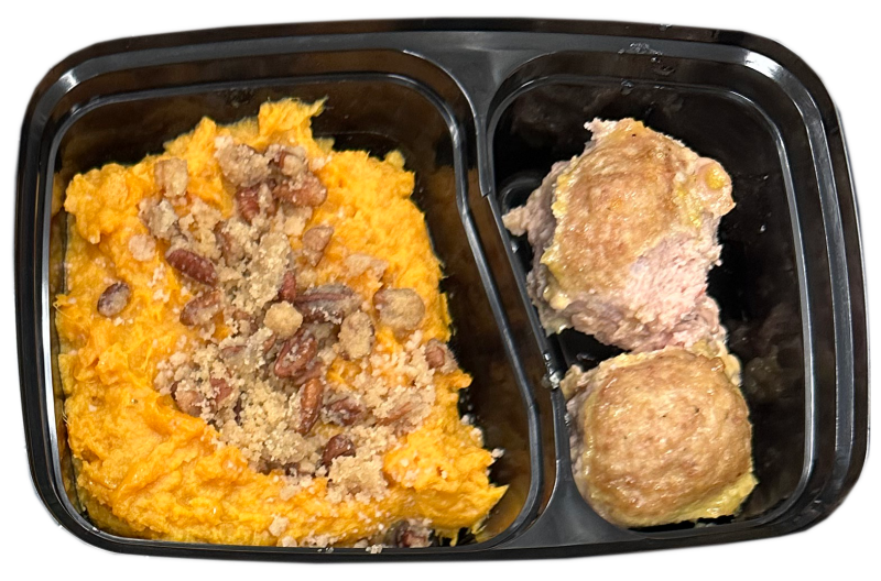 2 ham loaf-style meat balls + our sweet & nutty sweet potato casserole