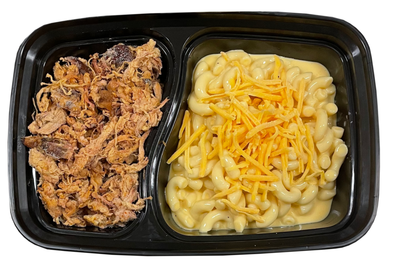 our lightly seasoned, pulled pork + creamy mac n cheese