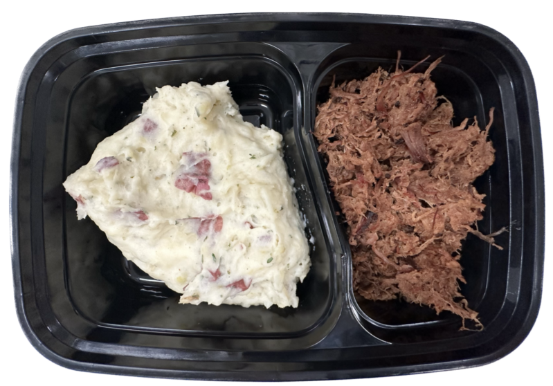 1/4 pound of our pulled smoked beef brisket + homemade Red Skinned Garlic Mashed Potatoes