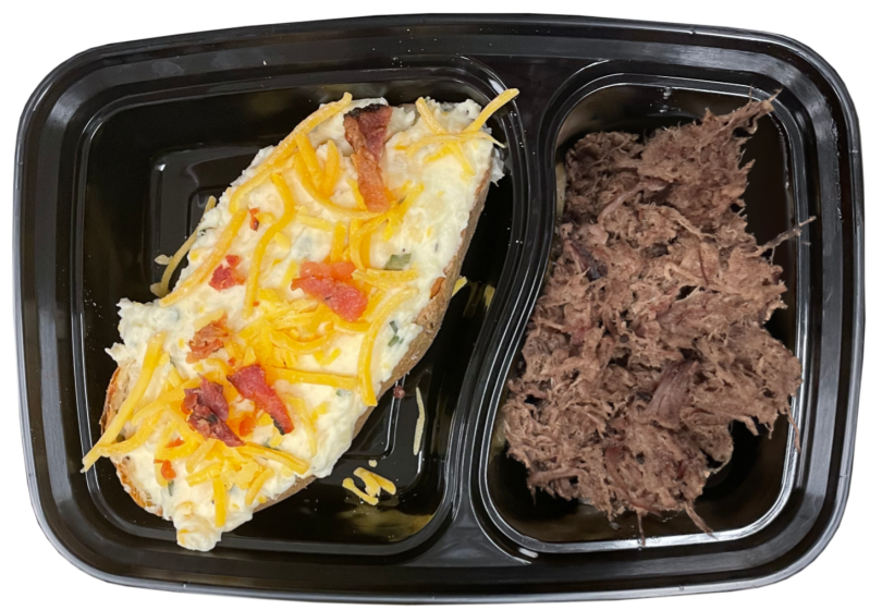 1/4 pound of our pulled smoked beef brisket + potato skin filled with potato & cheeses, topped with bacon, cheddar & chives